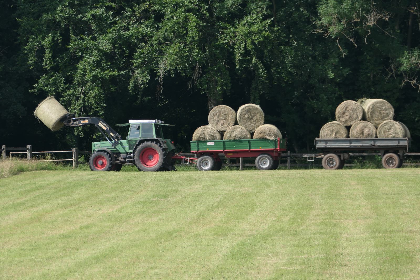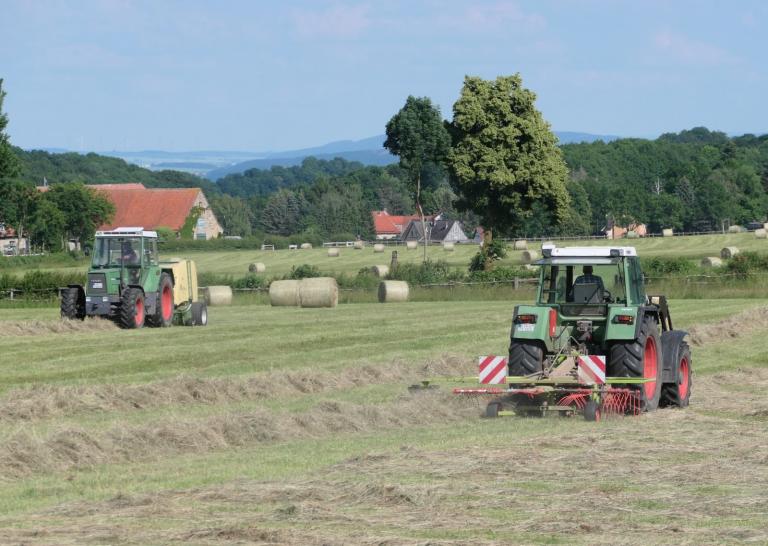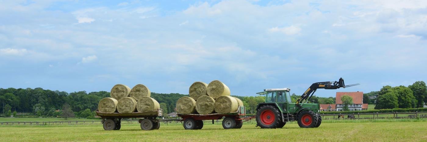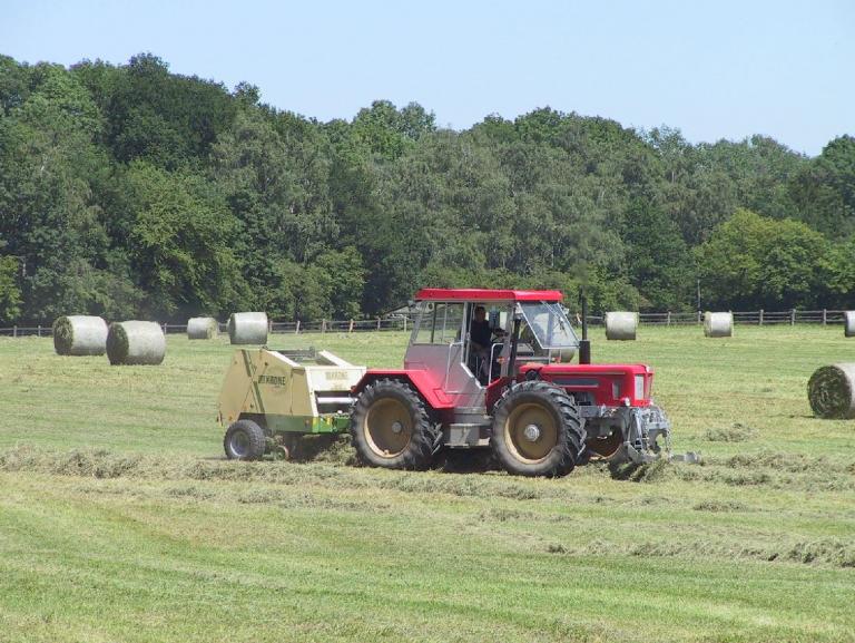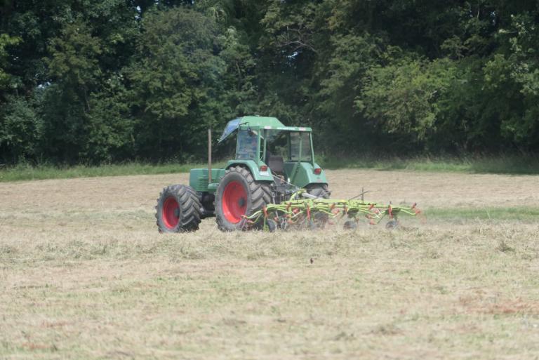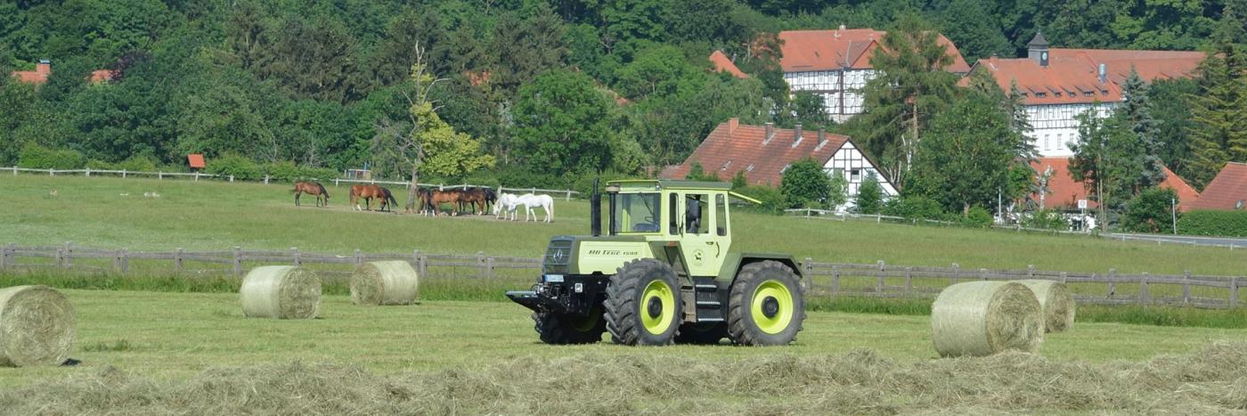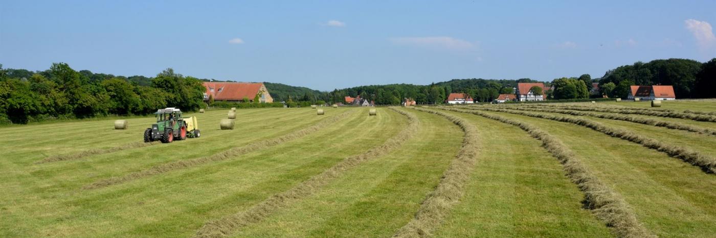 Für einen Gestütsbetrieb wie Altefeld ist es sehr wichtig, dass die Futtergrundlage überwiegend auf den eigenen Flächen gewonnen wird. Erst wenn die Wiesen im Frühjahr abgeblüht haben, beginnen wir mit dem Mähen. Das ausgewachsene Heu ist weitgehend frei von Blütenstaub, das bedeutet weniger Staub im Stall, es hat mehr Substanz und wird von den Pferden viel lieber gefressen als sehr junges Heu. Der Heubedarf wird vollständig von unseren eigenen Flächen gedeckt.
